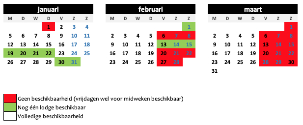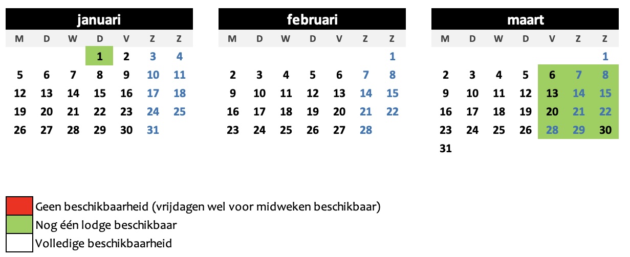 Voor de beschikbaarheid van 02-01-26 tot 03-04-26 ziet u de kalender hieronder. Voor de tarieven vanaf 03 april 2026 klikt u hier.