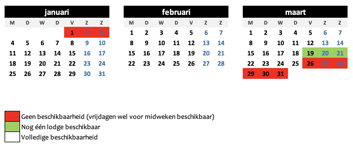 Voor de beschikbaarheid van 01-01-27 tot 01-04-27 ziet u de kalender hieronder. Voor de tarieven vanaf 02 april 2027 klikt u hier.